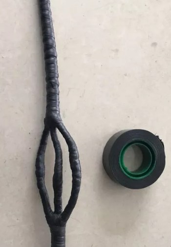 第六步:用自粘帶對(duì)以包扎完高粘帶部分繼續(xù)以半疊繞狀態(tài)進(jìn)行包扎,往返一次包扎且延伸到外護(hù)套處,包扎緊實(shí)。